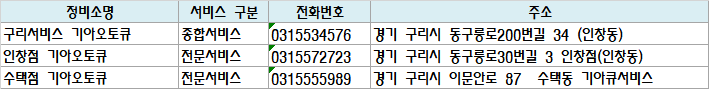 구리서비스 기아오토큐 | 종합서비스 | 0315534576 | 경기 구리시 동구릉로200번길 34 (인창동) |