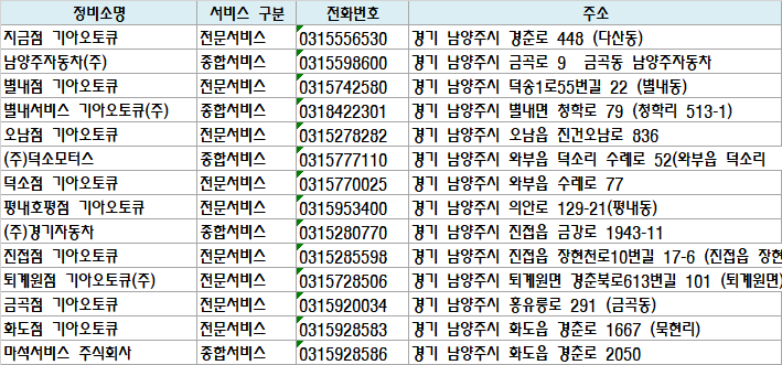 별내서비스 기아오토큐(주) | 종합서비스 | 0318422301 | 경기 남양주시 별내면 청학로 79 (청학리 513-1) |