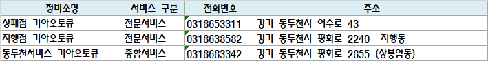 | 정비소명 | 서비스 구분 | 전화번호 | 주소 |