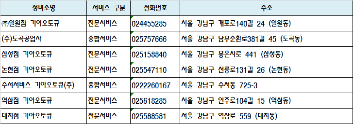 | 수서서비스 기아오토큐(주) | 종합서비스 | 0222260167 | 서울 강남구 수서동 725-3 | 지도 |
