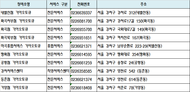 | 마곡종합서비스 기아오토큐 | 종합서비스 | 0236621371 | 서울 강서구 남부순환로 223-29(외발산동) | 지도 |