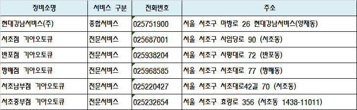 | 서초점 기아오토큐 | 전문서비스 | 025687001 | 서울 서초구 사임당로 90 (서초동) | 지도 |