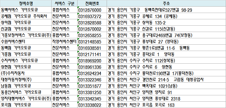 | 기흥보정서비스 기아오토큐(주) | 종합서비스 | 0312658255 | 경기 용인시 기흥구 용구대로2469번길 74(보정동) |