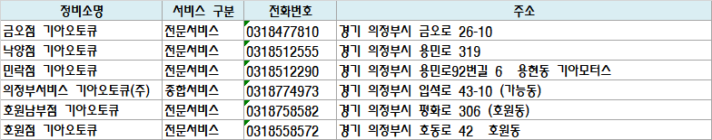 | 의정부서비스 기아오토큐(주) | 종합서비스 | 0318774973 | 경기 의정부시 입석로 43-10 (가능동) |