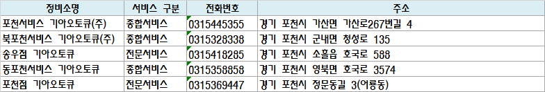 동포천서비스 기아오토큐 | 종합서비스 | 0315358858 | 경기 포천시 영북면 호국로 3574 |