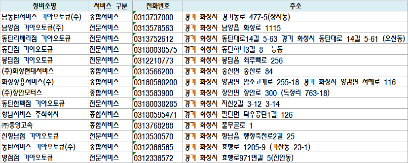 | 동탄서비스 기아오토큐(주) | 종합서비스 | 0312388585 | 경기 화성시 효행로 1205-9 (기산동 23-1) |