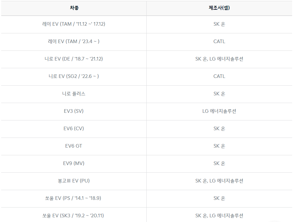 ※ SK3, DE, PU 차종 : 제조사(셀) SK 온 & LG 에너지솔루션社 이원화 공급