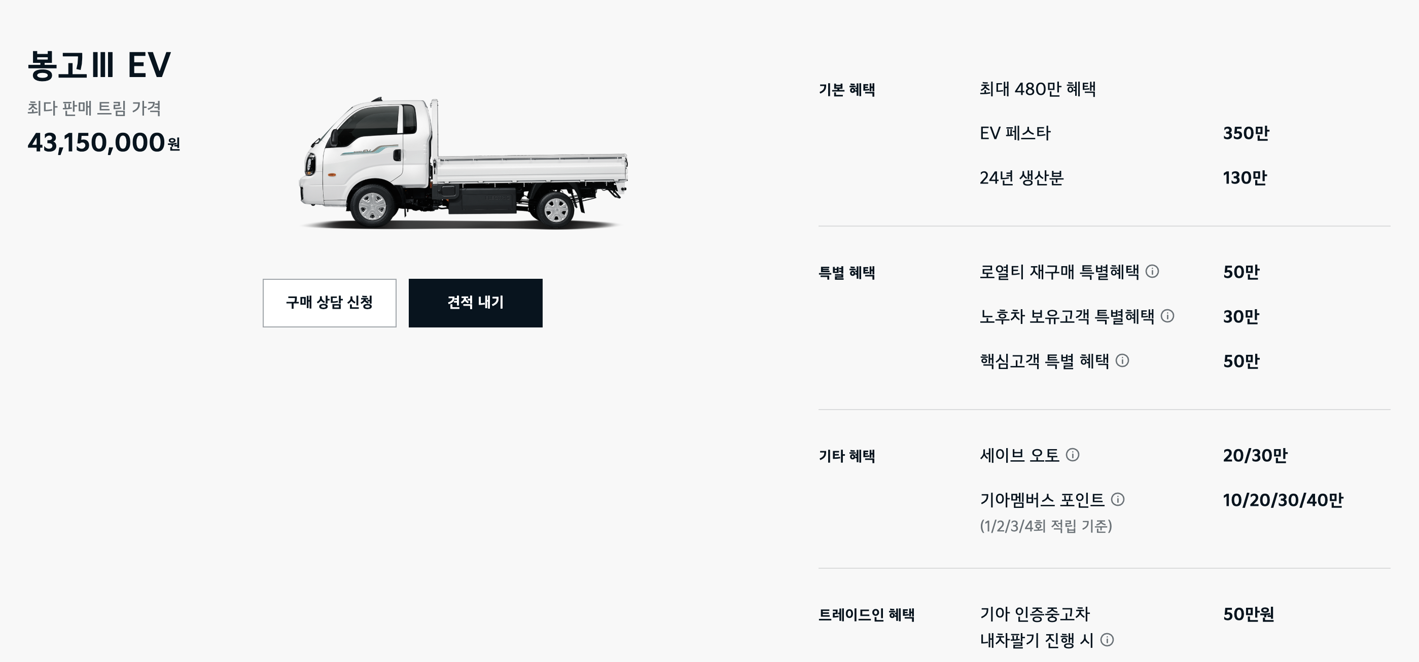 봉고 III EV의 최대 판매 트림 가격은 43,150,000원으로 책정되었습니다. 하지만 주목해야 할 점은, 다양한 정부 및 기아 자체 혜택을 통해 실질적인 구매 비용을 크게 낮출 수 있다는 것입니다.