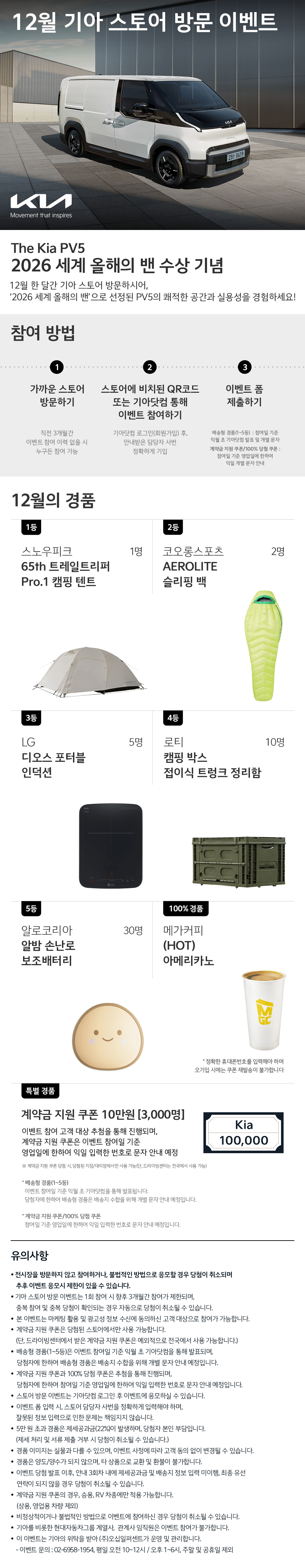 이번 12월 기아 방문 이벤트는 신차 PV5를 체험하고 100% 커피 쿠폰은 물론 캠핑 장비 득템의 기회까지 잡을 수 있는 알찬 행사입니다.