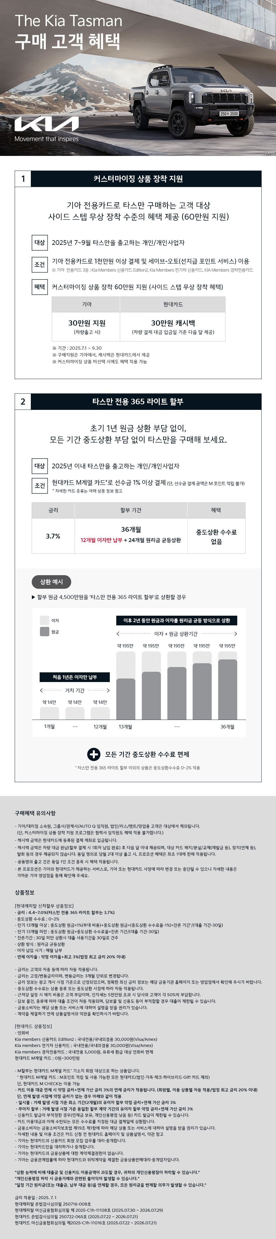 기아 타스만 출시와 함께 구매고객을 위한 특별한 금융혜택과 커스터마이징 상품 지원이 진행되고 있죠! 2025년 7~9월 타스만을 출고할 개인/개인사업자분들이라면 필수로 챙겨야 할 프로모션과 제대로 활용하는 법, 아래에서 꼼꼼히 확인해볼까요?