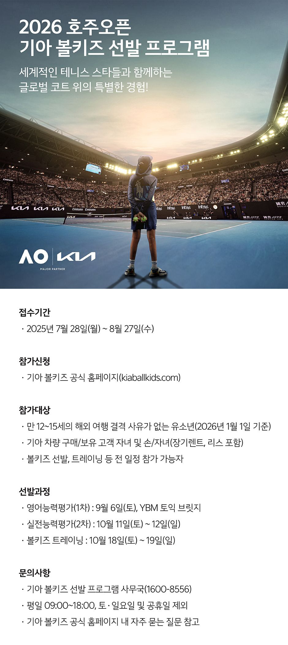 30초 핵심 요약 – 2026 호주오픈 볼키즈는 만12~15세 유소년이 세계적 테니스 무대에서 스타들과 함께 뛰는 찬스예요. 7월 28일부터 8월 27일까지 지원하며, 영어 테스트·실전 평가·트레이닝을 거쳐 최종 선발됩니다. 기아 차량 구매·보유 가족 자녀라면 필참이죠!