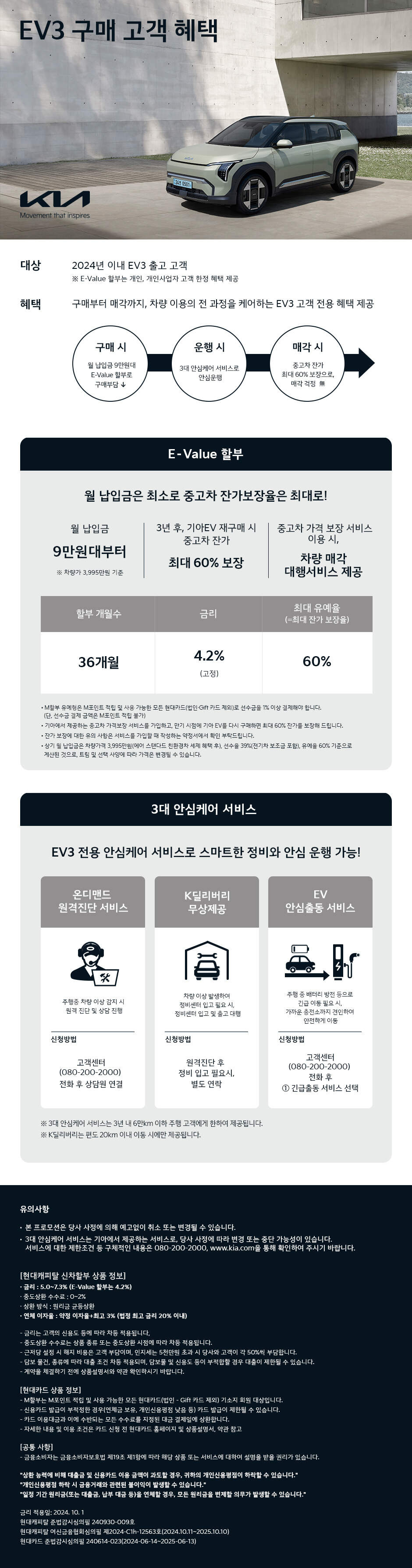 금리, 중도상환 수수료, 상환 방식 등에 대한 정보를 제공하며, 고객의 신용도에 따라 조건이 달라질 수 있음을 안내하고 있습니다. 이 프로그램은 EV3 구매 고객에게 차량 구매부터 운행, 매각까지 전 과정에 걸친 종합적인 혜택을 제공함으로써, 전기차 구매와 이용에 대한 부담을 줄이고 고객 만족도를 높이는 것을 목표로 하고 있습니다. 특히 E-Value 할부와 중고차 잔가 보장 프로그램은 고객의 초기 부담을 줄이고 미래 가치를 보장함으로써 전기차 시장 확대에 기여할 것입니다.