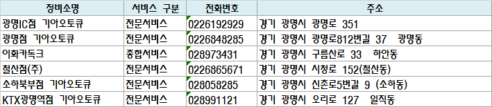 | KTX광명역점 기아오토큐 | 전문서비스 | 028991121 | 경기 광명시 오리로 127 일직동 |