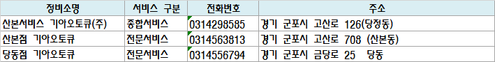 | 산본서비스 기아오토큐(주) | 종합서비스 | 0314298585 | 경기 군포시 고산로 126(당정동) |