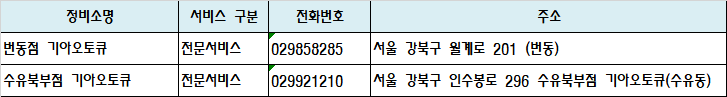 | 정비소명 | 서비스 구분 | 전화번호 | 주소 | 지도링크 |