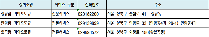 | 안암점 기아오토큐 | 전문서비스 | 029139999 | 서울 성북구 안암로 33 (안암동4가 29-1) 안암동4가 | 지도 |