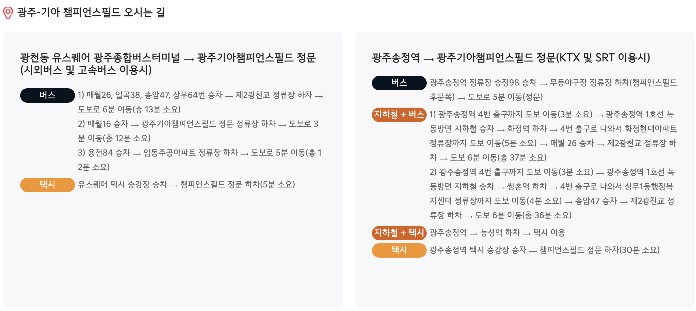 - 주차장은 협소해요! 광주-기아 챔피언스 필드 주차장이 매우 협소하기 때문에, 가급적 대중교통을 이용하시는 것을 강력하게 추천해 드립니다.